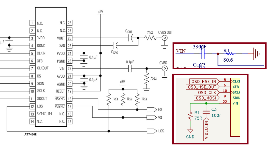 По документации видеосигнал подается через rc, где сначала R (75ом) на землю, а потом идет на C. Но наткнулся на проект, где человек сделал по другому, сначала на С а потом на R. Как по мне, то вроде это не правильно, кажется после кондера уже никак не компенсировать импеданс сигнальной линии. Но может я чего-то не знаю, подскажите. Спасибо.